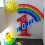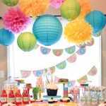 Обвязывают шары цветными лентами разной длины, чтобы ребенок мог легко достать тот, что ему понравился.Под потолком развешивают серпантин, всевозможные яркие бумажные гирлянды, изготовленные самим ребенком. Самые оригинальные работы именинника ставятся на видное место или развешиваются на стенах.